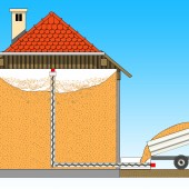 Складское помещение над котельным. Подача с помощью спускной трубы.
